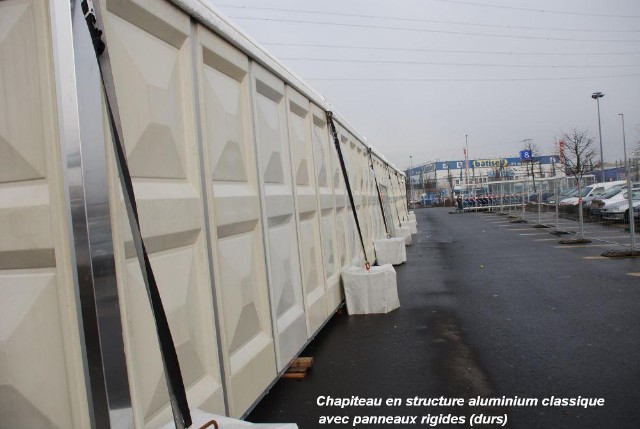 Chapiteau en structure aluminium auto portant. Dimensions disponibles : Largeur : 6 - 8 - 10 - 12 - 15 - 20 - 25m Longueur : par multiple de 5m